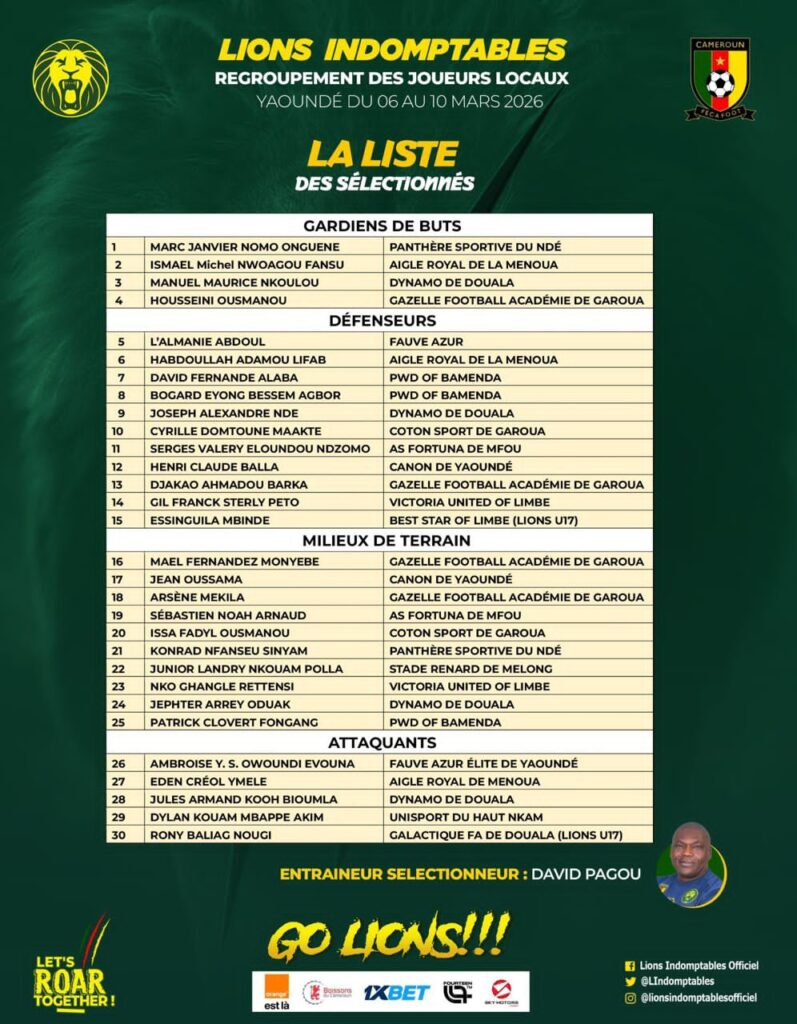 The coach has cast a wide net to assemble this 30-man squad, blending seasoned league veterans with the country’s most promising young talents. In the goalkeeping department, there is a notable shake-up as Édouard Sombang, who was the lone local player selected by Pagou for the 2025 AFCON, is a high-profile absentee. The shortlist instead features Michael Fansu, a 2025 CAF Confederations Cup campaigner, and Ballon d’Or nominee Husseini Ousmanou, who will both compete alongside Marc Janvier Nomo Onguene for the starting spot.