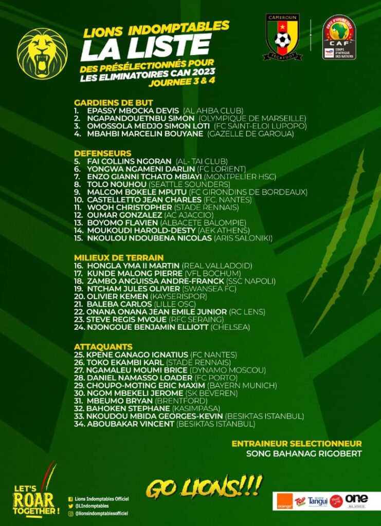 Coach Rigobert has pre-selected a list of 34 Lions in view of the 3rd and 4th match days of the 2023 TotalEnergies AFCON qualifiers set to take place in a home-and-away round-robin format, later this March.