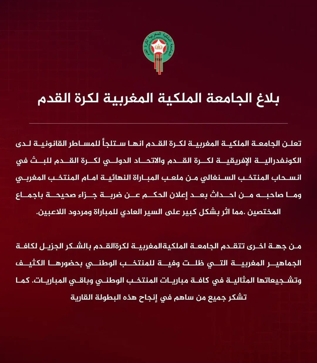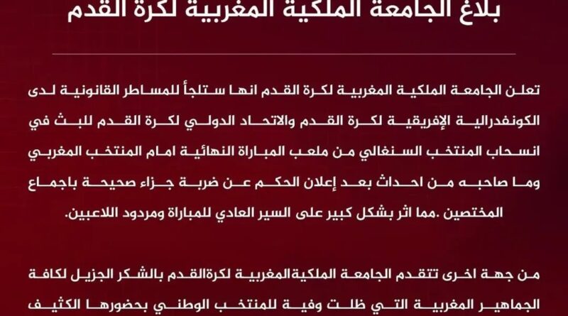 Read MoreThe Royal Moroccan Football Federation (FRMF) has officially announced it will advance a formal complaint to both CAF and FIFA