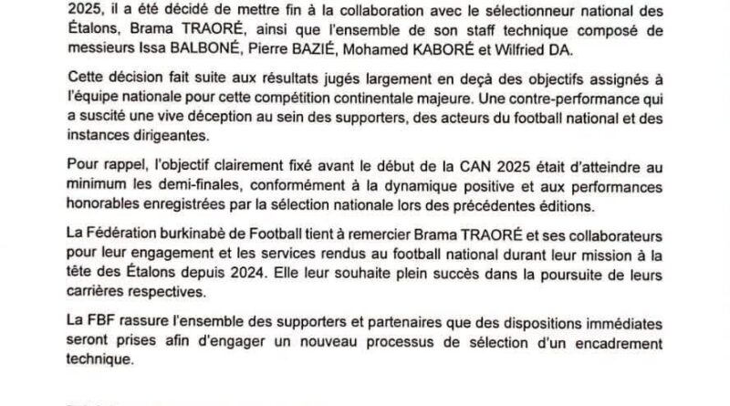 Read MoreThe Burkina Faso Football Federation (FBF) has officially announced the dissolution of the national team’s technical department, terminating the contract