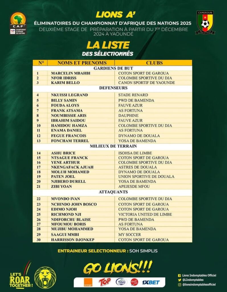 Following their recent Supercup victory, Coach Simplis Soh invites four key players from Colombe du Sud for the upcoming CHAN 2025 preparatory session. Despite so , a Notable absence from the list is Nathan Douala, amid rumors suggesting age discrepancies that could potentially impact Cameroon’s performance. Nathan’s absence in the Uniffac semis due to similar concerns further underscores the coach’s decision.