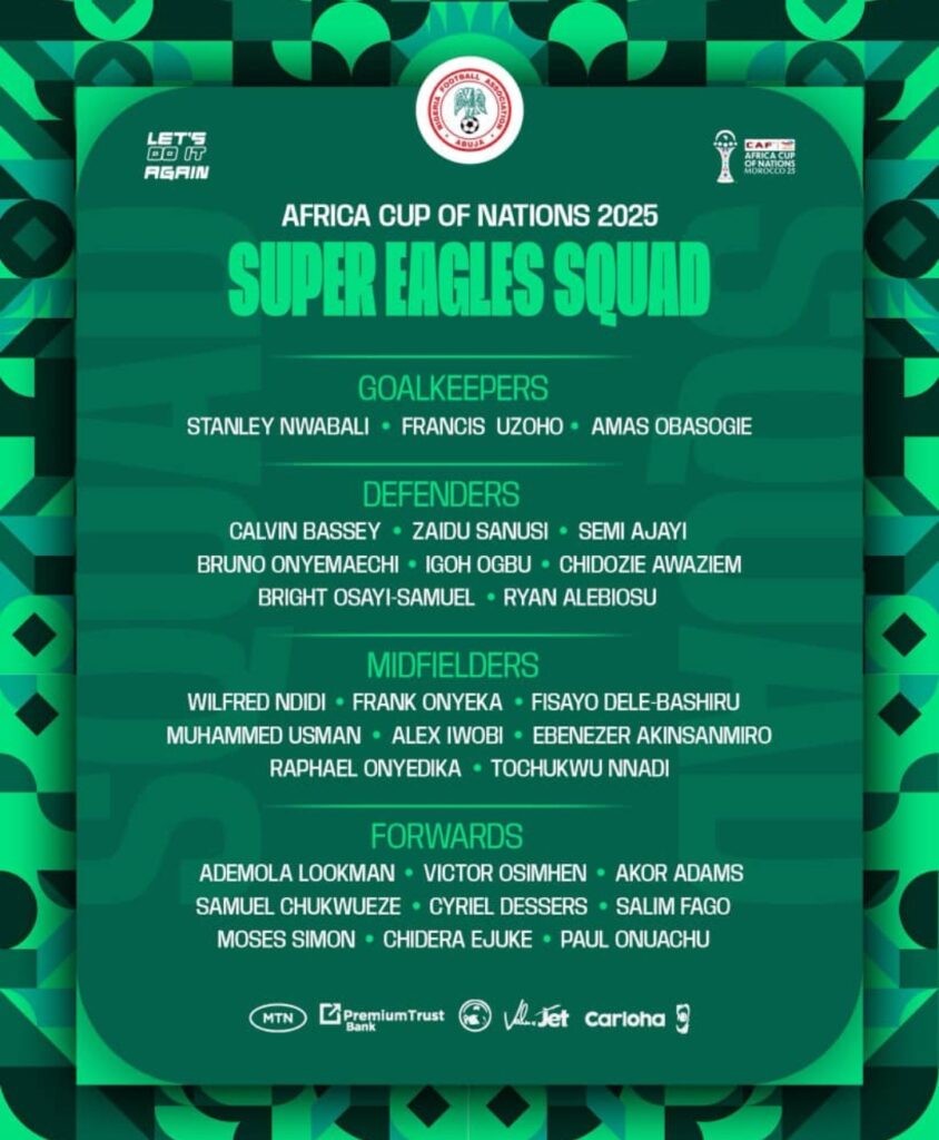 The Super Eagles of Nigeria have officially unveiled their final 28-man squad for the 2025 Africa Cup of Nations (AFCON) in Morocco, with Head Coach Eric Chelle making several bold selections and notable omissions as the three-time champions target a historic fourth continental title. The list, released just ten days before the tournament’s kickoff, balances experienced regulars with a contingent of fresh, untested talent.