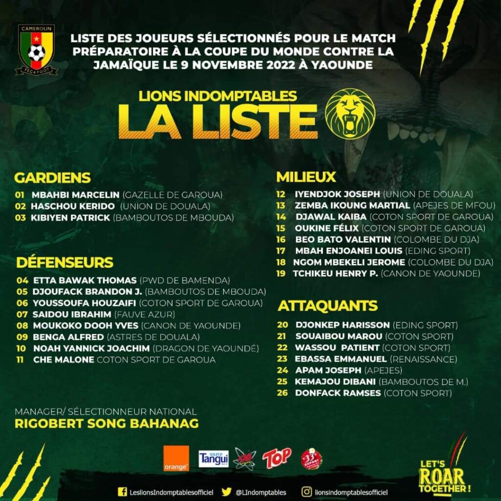 Coach Rigobert Song aims at snapping a couple of players to blend with professionals ahead of the Qatar journey, and the November camp will see selected players test themselves against Jamaica on November 9.
