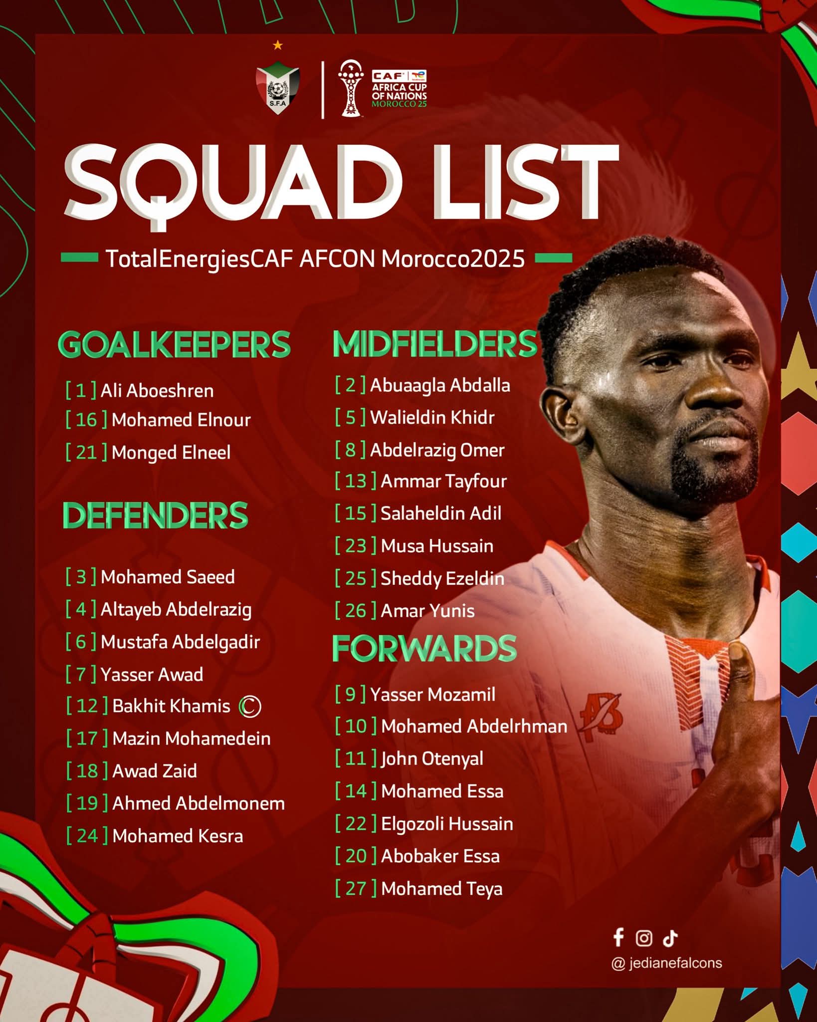 The squad is largely dominated by players from the local league, though a few are based outside Sudan: