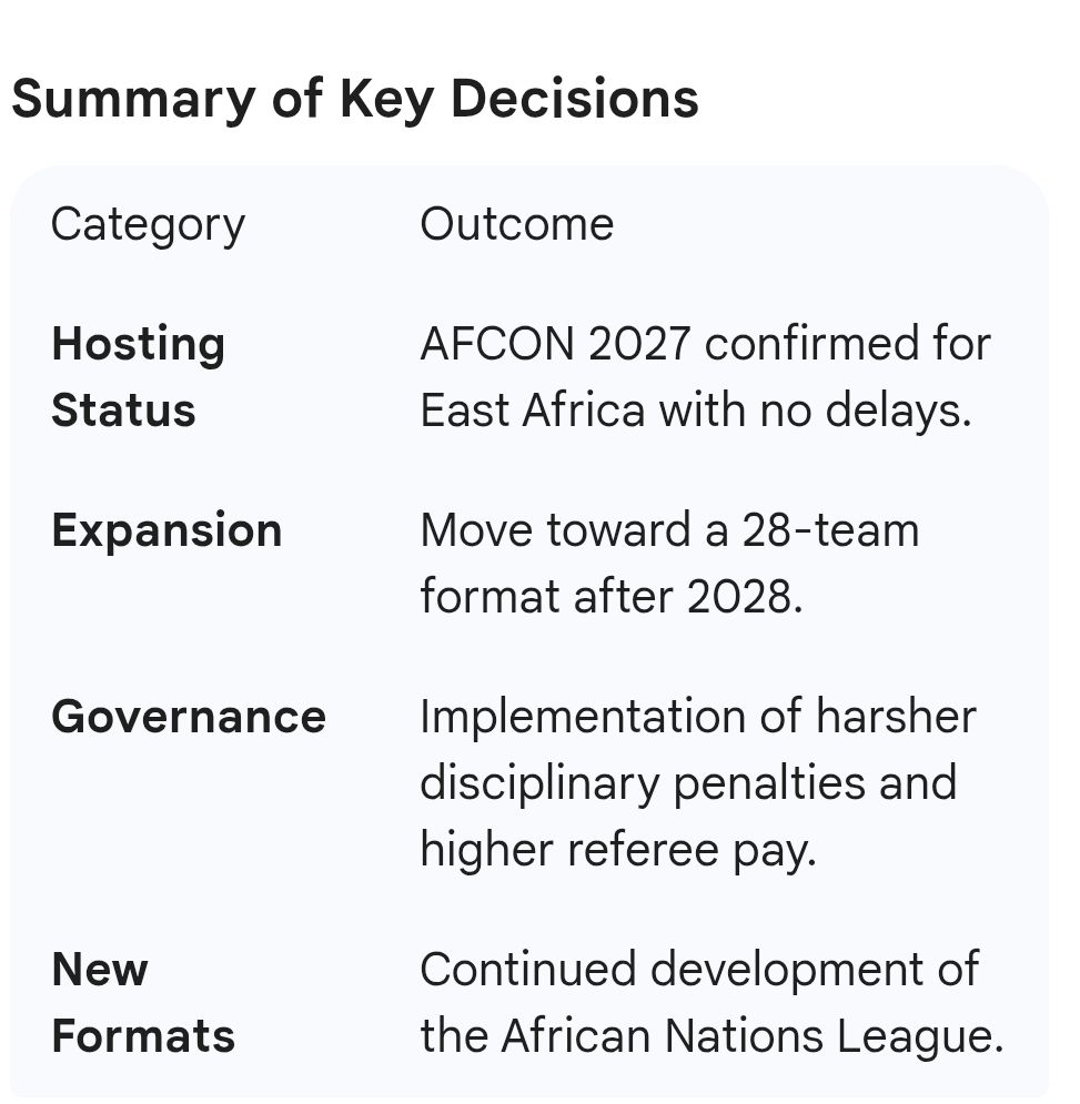 The committee addressed persistent rumors regarding the 2027 Africa Cup of Nations. President Motsepe firmly dismissed any claims that the tournament would be postponed to 2028 or moved to a different location due to infrastructure concerns. He reinforced CAF’s total confidence in the “Pamoja” bid, confirming that Kenya, Tanzania, and Uganda remain the official hosts and are making satisfactory progress toward their deadlines.