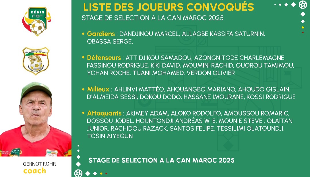Coach Gernot Rohr has unveiled the preliminary squad for the Benin Cheetahs in preparation for the 2025 Africa Cup of Nations (CAN). A training camp will take place in Morocco, after which the final list will be announced.
