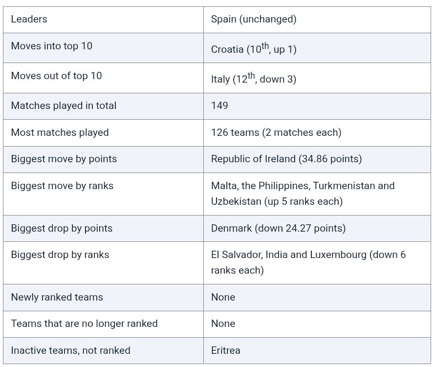 Towards the top, Brazil (5th, up 2) have risen two places at the expense of Portugal (6th, down 1) and the Netherlands (7th, down 1), while Italy (12th, down 3) have slipped out of the top 10. They fell three spots after a 4-1 home defeat by Norway, whose victory means that they are one of the 42 outfits guaranteed to grace the global showpiece in 2026.