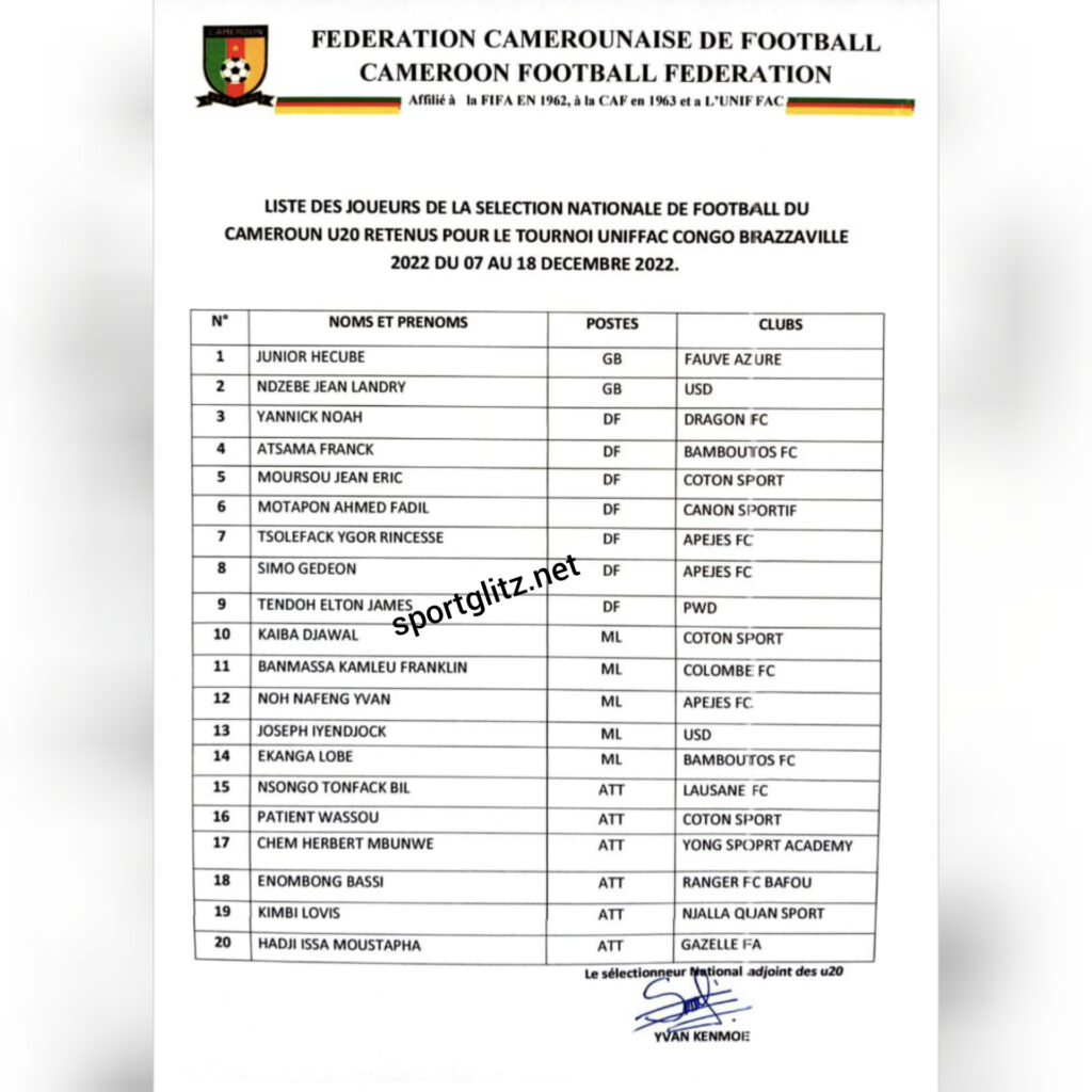 Having been in camp since Saturday December 3rd, Junior Lions assistant manager, Yvan Kenmoe has listed a strong squad of 20 to make the trip to Congo in view of the 2022 U20 UNIFFAC, scheduled for Wednesday Dec. 7.