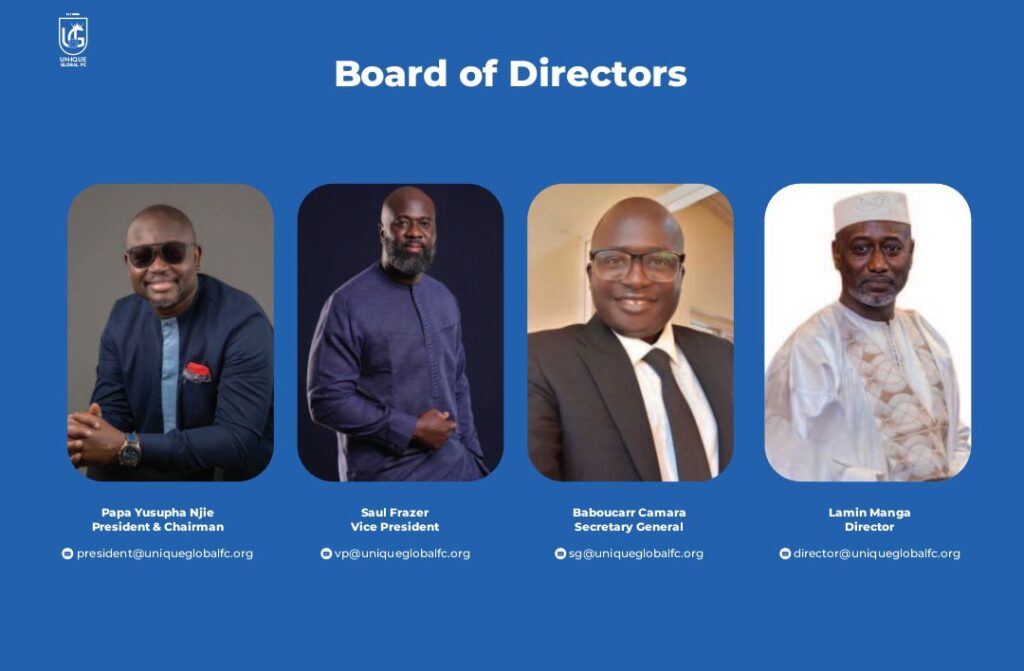 The club’s management, led by President Papa Yusupha Njie—CEO of the technology conglomerate Unique Group—operates on the principle that sports infrastructure and education are essential tools for social development. Unlike the traditional model of community-run clubs, Unique Global FC utilizes a corporate structure to manage its first-class academy. The Board of Directors, which includes Vice President Saul Frazer and Director Lamin Manga, oversees a technical department headed by Ibra Jagne. Their primary objective is to move beyond local competition and transform raw talent into athletes capable of competing in professional global markets.